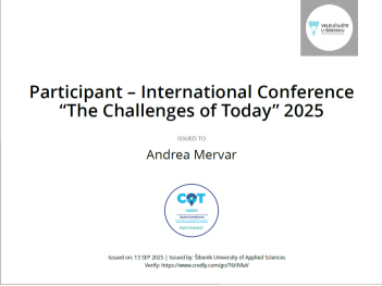 Andrea Mervar, PhD collaborator on the project "Is Croatia's Macroeconomic Convergence Sustainable?" (JMKHO), funded by the National Recovery and Resilience Plan 2021-2026 - NextGenerationEU, participated from 11 to 13 September 2025 in the seventh international scientific and professional conference "Challenges of Today".