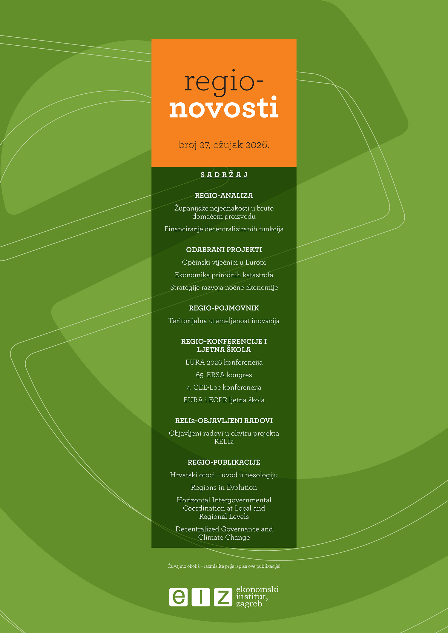 Regio-novosti donosi analizu županijskih nejednakosti u BDP-u i financiranja decentraliziranih funkcija. U rubrici „Odabrani projekti“ predstavljeni su projekti „Općinski vijećnici u Europi“, „Ekonomika prirodnih katastrofa: Dokazi o poplavama rijeka u Austriji“ i „Strategije razvoja noćne ekonomije: integrirani pristup upravljanju noćnom ekonomijom u Europskoj uniji (NITIES)“, dok se „Regio-pojmovnik“ bavi teritorijalnom utemeljenošću inovacija.