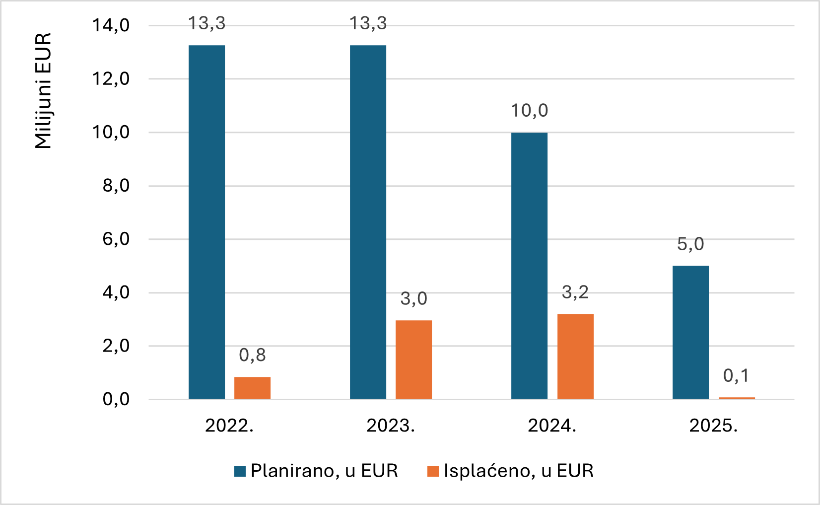 Planirana sredstva za tu namjenu su se tijekom razdoblja značajno smanjivala, ne samo rebalansom državnog proračuna, nego i u ukupno planiranom iznosu. Za prve dvije godine planirano je 13,3 milijuna eura (2022. i 2023.), da bi taj iznos pao na samo četvrtinu tada planiranih sredstava, odnosno na 3,0 milijuna eura (2026.) (tablica 1). Podaci na slici 1 prikazuju da su u 2023. i 2024. godini isplaćeni značajni iznosi sredstava koji su bili namijenjeni financijskim poticajima iz državnog proračuna općinama i gradovima koje su se dobrovoljno funkcionalno spojile radi zajedničkog obavljanja javnih poslova iz djelokruga lokalne samouprave. Tako je u 2023. isplaćeno 22,3 posto, a u 2024. 32,0 posto planiranih sredstava za dobrovoljno funkcionalno spajanje jedinica lokalne samouprave. Prošle 2025. godine isplaćeno je svega 1,4 posto planiranih sredstava prema javno objavljenim podacima Ministarstva financija.