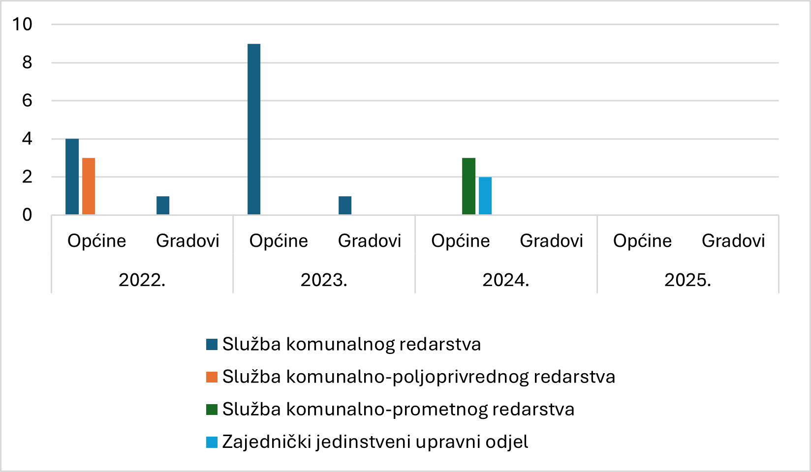 Od srpnja 2022. pa do danas, prema modelu A, općine su zapošljavale zajedničkog službenika za obavljanje nekih od lokalnih poslova, uglavnom komunalne i poljoprivredne redare. Broj općina koje su zapošljavale zajedničke službenike bio je 19 (2022.), 25 (2023.), 22 (2024.) te tri (2025.). Broj gradova koji su zapošljavali zajedničke službenike bio je daleko manji od broja općina pa je svega pet gradova (2023.) i osam gradova (2023.) zaposlilo zajedničkog službenika za obavljanje lokalnih poslova (slika 2).