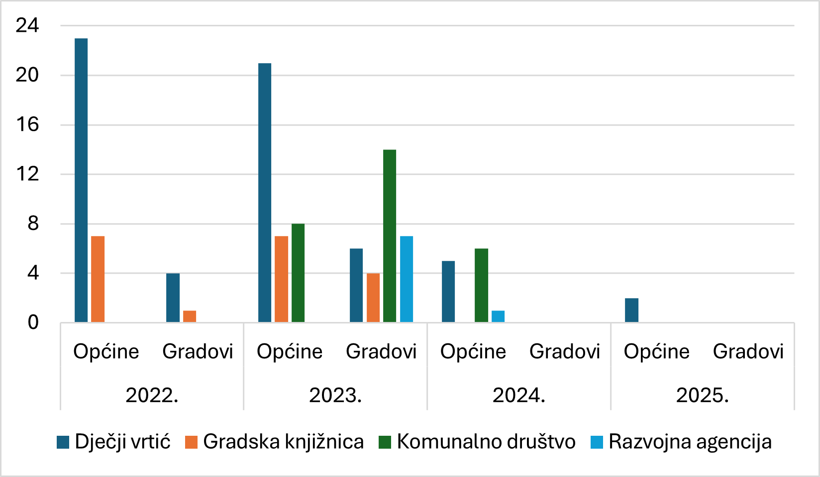Najviše se općina dobrovoljno funkcionalno spojio po Modelu B i osnovao zajedničko trgovačko društvo ili ustanovu. Organiziranje zajedničkog dječjeg vrtića, gradske knjižnice i komunalnog društva rezultat je dobrovoljnog funkcionalnog spajanja u najvećem broju općina. Ukupno je u 30 općina i pet gradova osnovano zajedničkih ustanova (2022.), u 36 općina i 31 gradu osnovano zajedničkih ustanova i trgovačkih društava (2023.)., dok je samo u 12 općina (2024.) i u dvije općine (2025.) osnovano zajedničkih dječjih vrtića i komunalnih društava te zajednička razvojna agencija. Prema javno dostupnim podacima posljednje dvije godine u gradovima nisu osnovane zajedničke ustanove i trgovačka društva (slika 4).