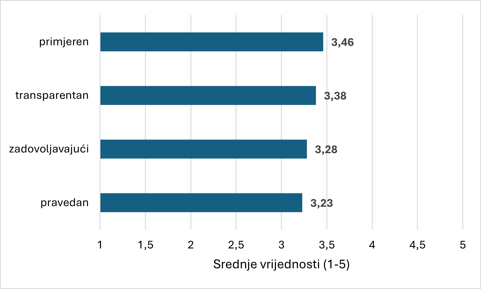 U nastavku su ispitanici ocjenjivali kvalitetu procesa odlučivanja (procesna legitimnost; Starke i Lünich, 2020) na temelju četiri tvrdnje, pri čemu je konstruiran kompozitni indeks kao njihov prosjek (α = 0,91; M = 3,34; SD = 0,86). Slika 2. pokazuje da ispitanici najvišom ocjenom vrednuju primjerenost procesa, odnosno jasnoću i smislenost pravila i postupaka (M = 3,46; SD = 0,90). Slijedi percepcija transparentnosti, pri čemu ispitanici smatraju da su informacije dostupne i razumljive (M = 3,38; SD = 1,00). Zadovoljstvo samim procesom ocijenjeno je nešto niže (M = 3,28; SD = 0,96), dok je percepcija pravednosti, odnosno činjenica da se odluke donose korektno i bez favoriziranja tijekom procesa, ocijenjena najnižom ocjenom (M = 3,23; SD = 1,00), što upućuje na određene sumnje u nepristranost donošenja odluka. Vrijednosti upućuju na umjerenu, blago pozitivnu percepciju procesa odlučivanja.
