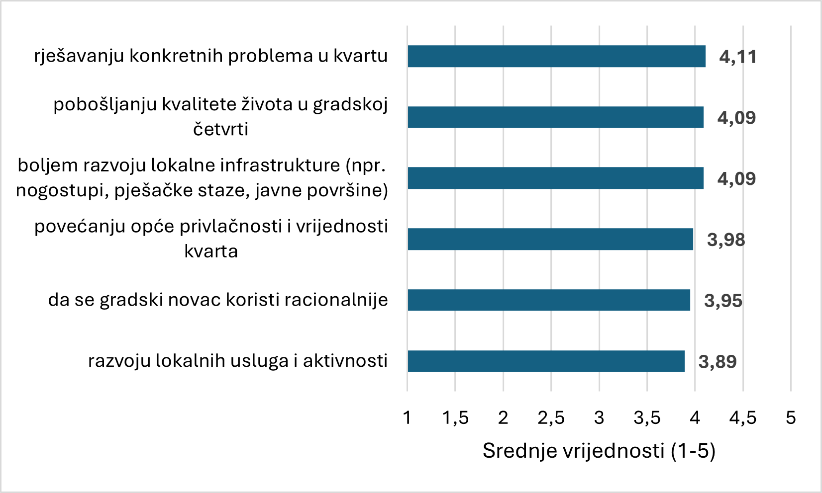 Percepcija ostvarenja ciljeva participativnog budžetiranja procijenjena je pomoću šest tvrdnji (Starke i Lünich, 2020), na temelju kojih je izrađen kompozitni indeks. Slika 4. prikazuje percepcije ispitanika. Rezultati upućuju na visoku razinu percepcije ostvarenja ciljeva participativnog budžetiranja (α = 0,90; M = 4,01; SD = 0,69), pri čemu ispitanici smatraju da projekti financirani kroz ovaj model u velikoj mjeri doprinose postizanju ključnih ciljeva na lokalnoj razini. Najvišom ocjenom izdvajaju doprinos rješavanju konkretnih problema u kvartu (M = 4,11; SD = 0,83), kao i poboljšanje kvalitete života i razvoj lokalne infrastrukture (oba M = 4,09), što upućuje na snažnu percepciju ostvarenja neposrednih i vidljivih ciljeva. Nešto niže, ali i dalje visoko, procjenjuju doprinos povećanju privlačnosti i vrijednosti kvarta (M = 3,98) te racionalnijem korištenju javnih sredstava (M = 3,95), dok je relativno najslabije ocijenjen doprinos razvoju lokalnih usluga i aktivnosti (M = 3,89). Unatoč tim razlikama, sve vrijednosti nalaze se u visokom rasponu, što ukazuje na to da građani participativno budžetiranje percipiraju kao učinkovit mehanizam za ostvarenje ciljeva lokalnog razvoja.