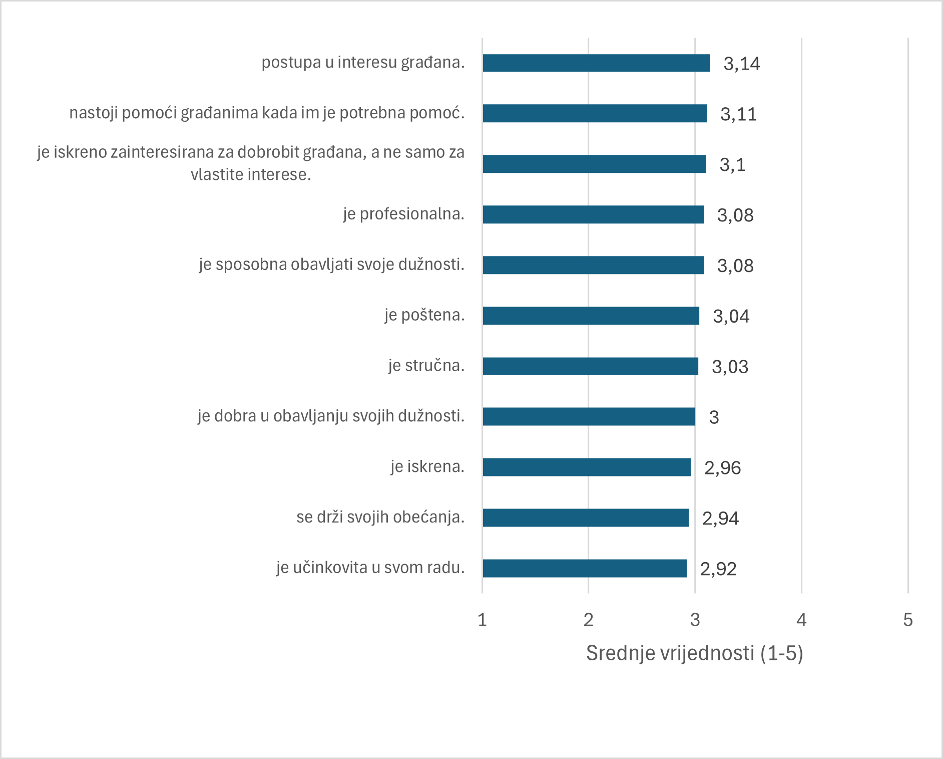 Unatoč pozitivnoj percepciji učinaka i relativno visokoj prihvaćenosti odluka, razina povjerenja u lokalnu vlast je i dalje umjerena (M = 3,04). Građani u većoj mjeri vjeruju da lokalna vlast djeluje u njihovu interesu, ali istodobno izražavaju rezerve u pogledu njezine učinkovitosti i dosljednosti u ispunjavanju obećanja. Ovakav rezultat upućuje na to da pozitivni ishodi pojedinih politika nisu dovoljni za izgradnju općeg povjerenja u institucije, koje je uvjetovano širim društvenim i političkim kontekstom (Ardanaz i sur., 2022).